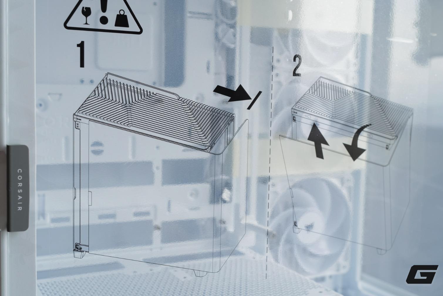 Ở mép kính, Corsair thêm một dải cao su nhỏ có logo thương hiệu, vừa giúp cầm nắm dễ hơn, vừa đóng vai trò như chi tiết trang trí. Ngoài ra, hãng cũng cẩn thận dán hướng dẫn cách mở phần mặt kính.