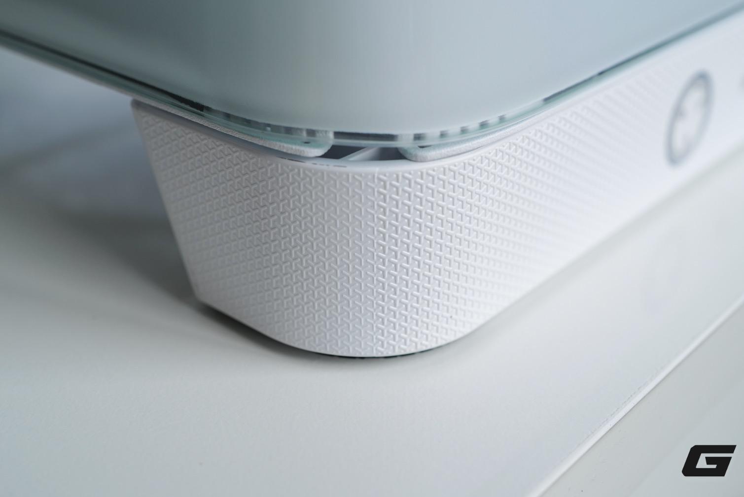 Thiết kế này trông khá tinh tế, nhưng chất liệu nhựa hơi mềm, khiến bề mặt có thể bị lõm nhẹ nếu có tác động mạnh vào. Bù lại, chất liệu này giúp giảm trọng lượng tổng thể của khung máy, đồng thời hạn chế cộng hưởng rung khi quạt hoặc tản nhiệt hoạt động ở tốc độ cao.