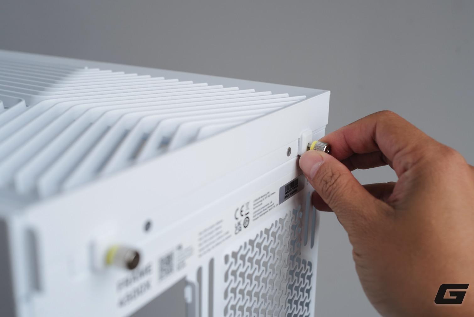 Phần phía sau case trông khá truyền thống, nhưng vẫn có nhiều chi tiết nhấn mạnh yếu tố thẩm mỹ, chẳng hạn ốc vặn tay có chốt giữ và viền màu vàng đặc trưng.