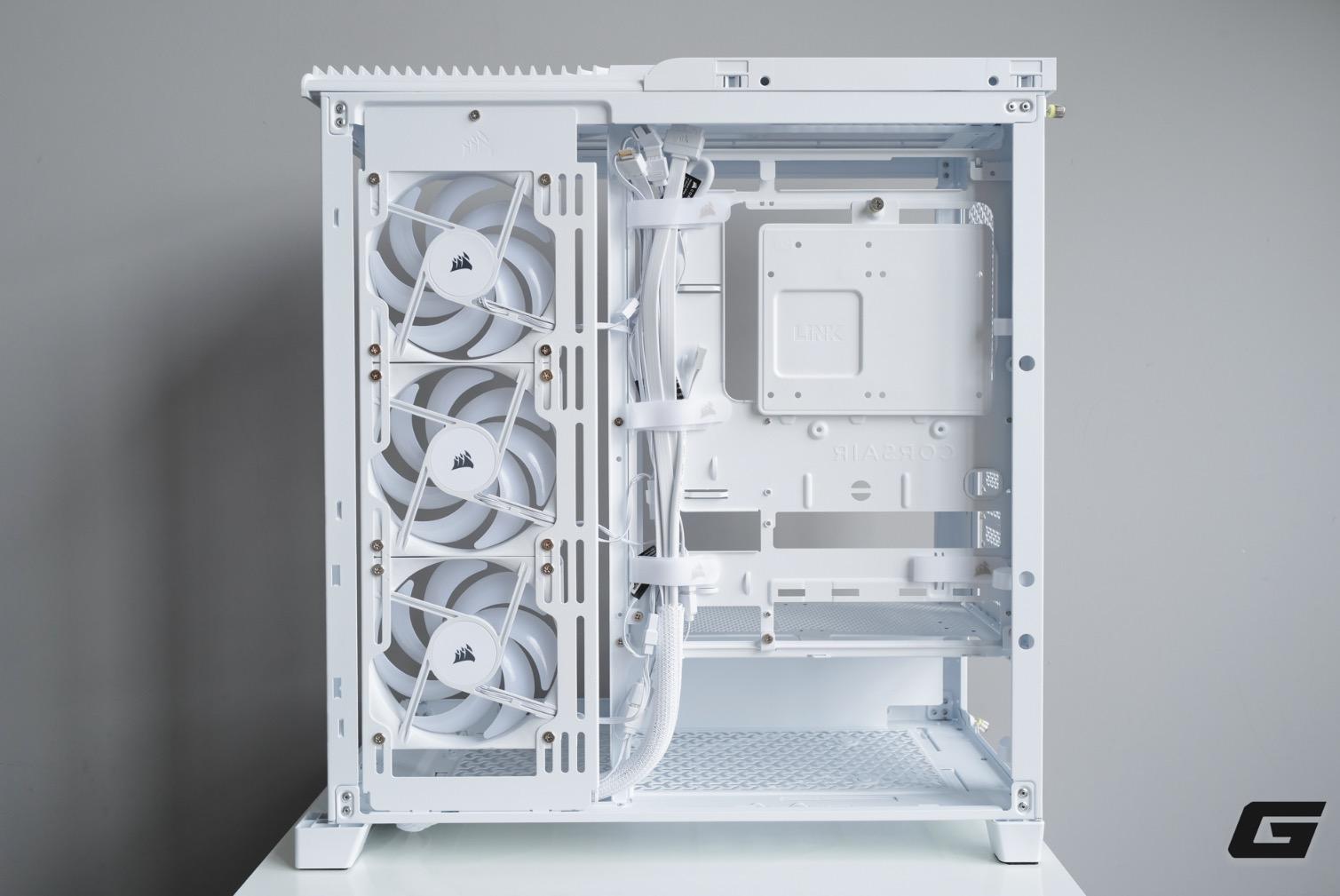 Ba quạt đi kèm FRAME 4500X RS-R ARGB là loại cánh đảo chiều, giúp hút gió trực tiếp từ hông case trong khi vẫn giữ được mặt trước gọn gàng và đồng nhất về thẩm mỹ. Corsair bố trí nhiều dây dán ở vị trí chiến lược để quản lý dây cáp gọn gàng, đồng thời một phần dây I/O cũng được bọc vải bảo vệ, giúp tổng thể bên trong trông ngăn nắp hơn.