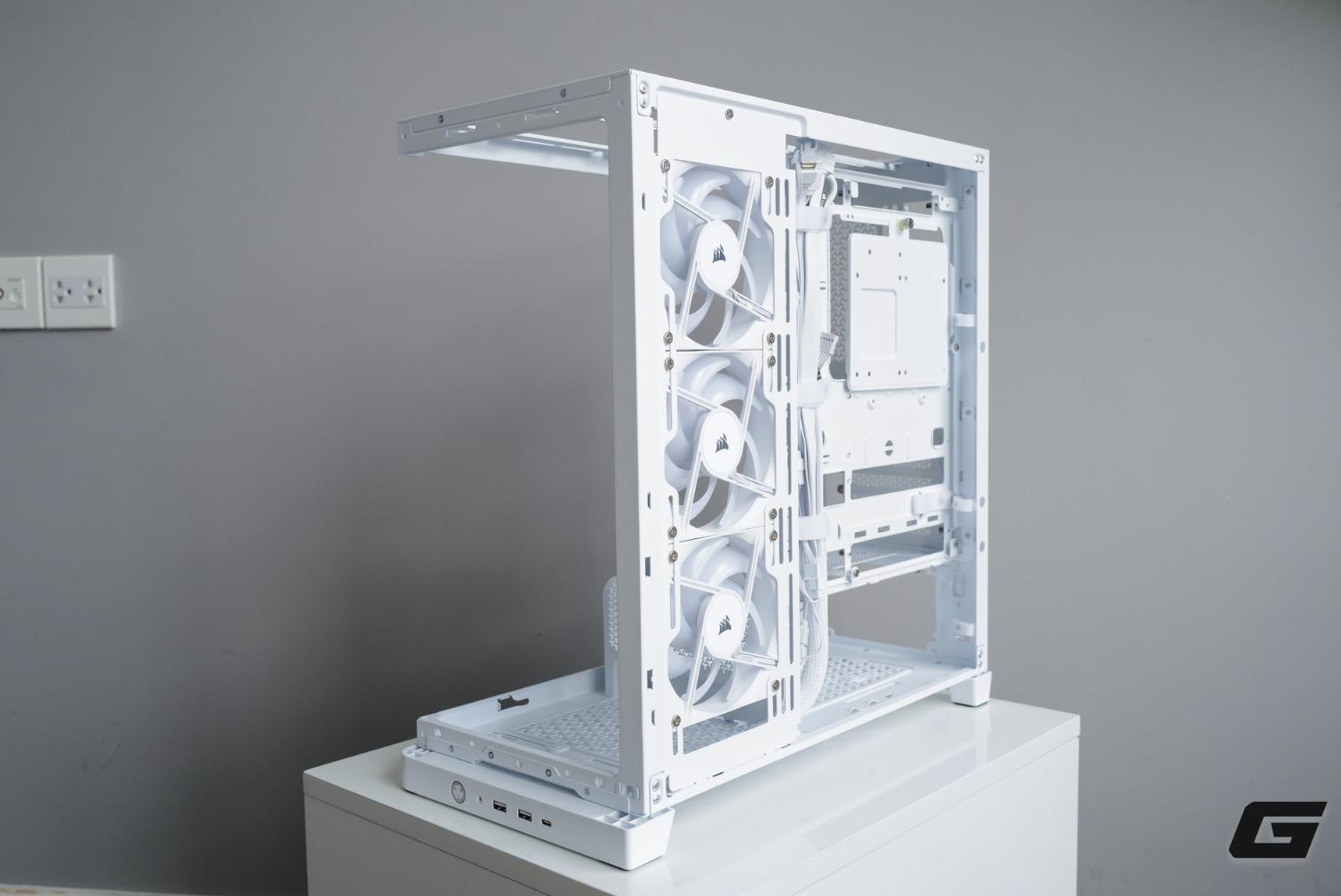 Phần che nguồn bên trong được trang trí với họa tiết thoát khí hình chữ Y đặc trưng, bo tròn ở phía trước để đồng bộ với phong cách bo góc tổng thể. Corsair có bố trí lỗ gắn hai quạt bổ sung, giúp hút gió gián tiếp vào khoang trong.